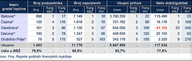 Od ukupno 23 grada i općine Bjelovarsko–bilogorske županije, najviše poduzetnika je bilo u Bjelovaru broju poduzetnika, broju zaposlenih, ukupnom prihodu i neto dobitku, odnosno gubitku, na prvom mjestu je Bjelovar, a potom slijedeČazma, Garešnica, Daruvar i Grubišno Polje.