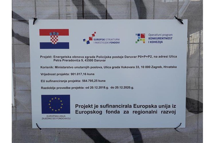 Projekt sufinancira Europska unija iz Europskog fonda za regionalni razvoj, a on se provodi u okviru Operativnog programa ”Konkurentnost i kohezija” 2014.–2020. Ministarstva graditeljstva i prostornog uređenja, Fonda za zaštitu okoliša i energetsku učinkovitost. Ugovor o dodjeli bespovratnih sredstava za ovaj projekt potpisan je 20. prosinca 2018. godine, a ukupna vrijednost projekta iznosi 1.245.488,41 kuna od čega su bespovratna sredstva fonda 564.795,25 kuna. Projektom energetske obnove na zgradi Policijske postaje financiraju su slijedeće aktivnosti: izrade tehničke dokumentacije, radovi na energetskoj obnovi zgrade, usluga stručnog i projektantskog nadzora, upravljanje projektom i administracija, promidžba i vidljivost te energetski pregled i izrada energetskog certifikata nakon energetske obnove.