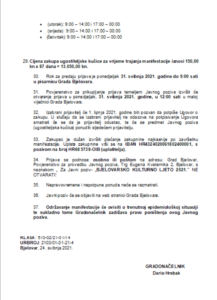 Grad Bjelovar raspisao je javni poziv za pružanje ugostiteljskih usluga na manifestaciji ”Bjelovarsko kulturno ljeto 2021” čije je održavanje planirano od 18. lipnja do 12. rujna u ukupnom trajanju od 87 dana, a lokacija je središnji gradski park, odnosno Trg Eugena Kvaternika.