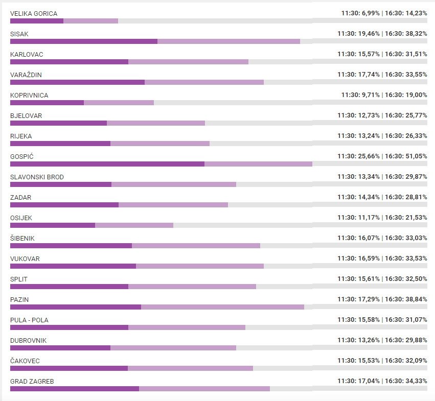 Do nedjelje u 16,30 glasovalo je 29,18 posto, što je 6,36 posto manje nego u prvom krugu kada je glasovalo 35,54 posto. U drugom krugu lokalnih izbora prije četiri godine do 16,30 glasovalo je 27,45 posto birača.