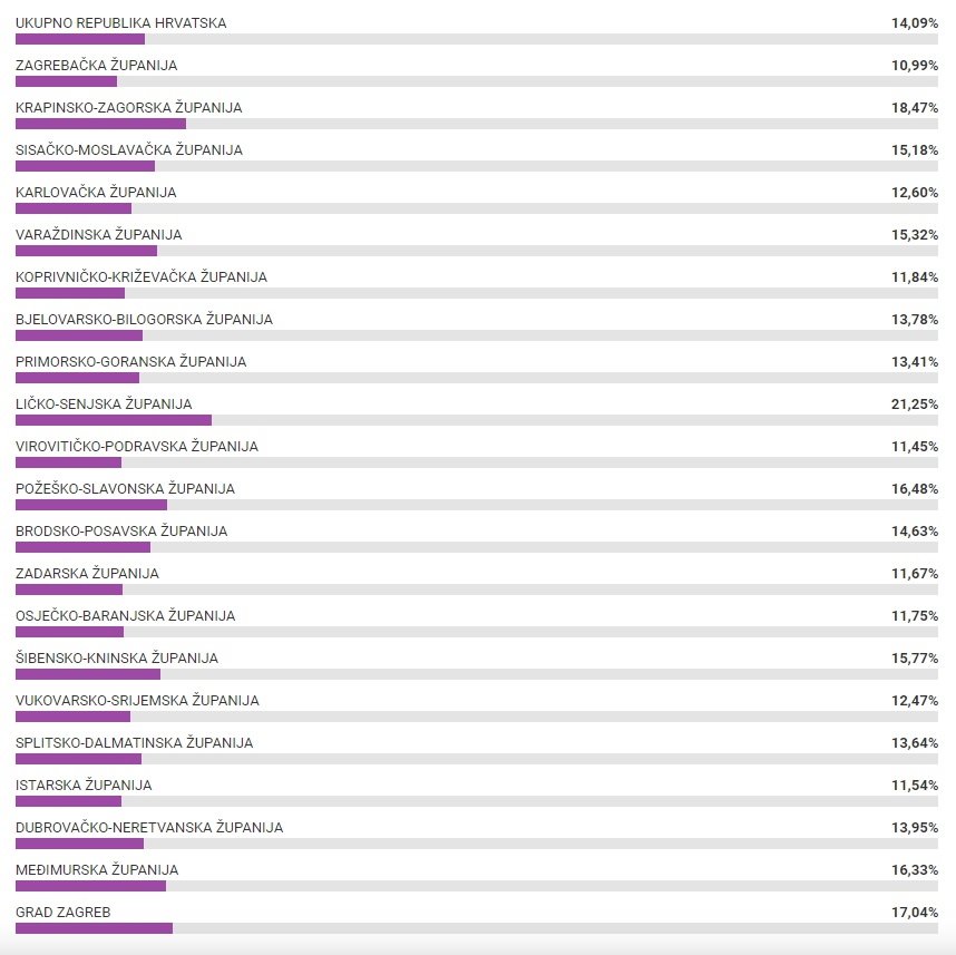 Među županijama rekorderi po izlaznosti su Ličko senjska (44,03 posto) i Krapinsko-zagorska županija (40,56), najmanju izlaznost imale su Zagrebačka (22,91 posto) i Istarska županija (23,32 posto).