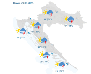 Na istoku zemlje bit će nešto toplije – do 31 °C, ali će poslijepodne i ondje stići kiša i grmljavina, ponegdje uz tuču i obilnu oborinu.