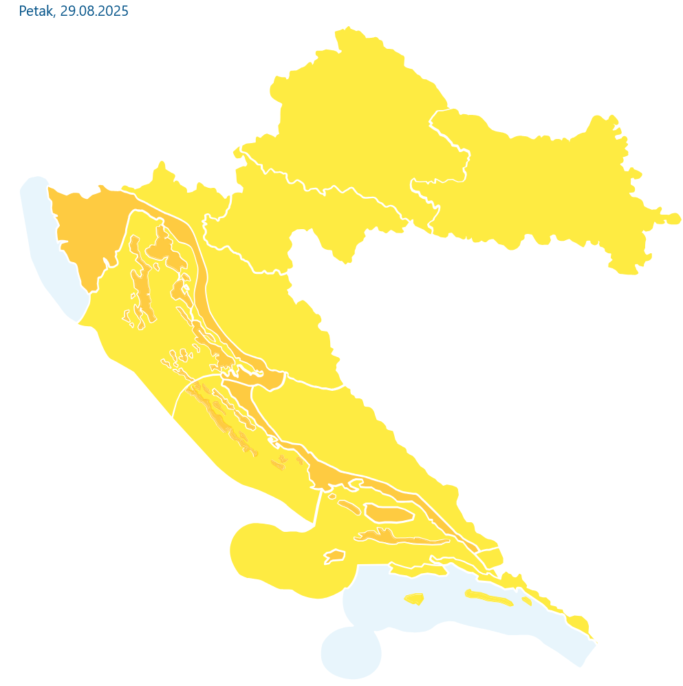 Prema riječima mr. sc. Dragoslava Dragojlovića iz DHMZ-a za HRT, u prvom dijelu petka naoblačenje s pljuskovima i grmljavinom zahvatit će sjeverni Jadran i Gorsku Hrvatsku. Ponegdje se očekuju izraženiji pljuskovi s obilnom oborinom i olujnim nevremenom. Puhat će umjereno i jako jugo i jugozapadnjak, a najviša temperatura kretat će se između 25 i 28 °C.