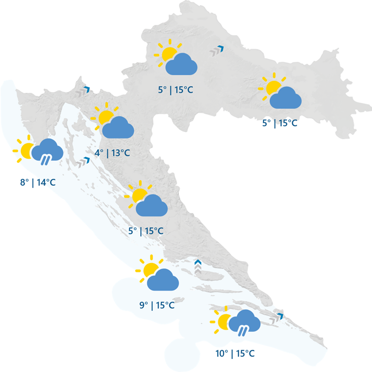 Djelomice sunčano uz promjenljivu naoblaku. Ujutro je malo kiše moguće na jugu Dalmacije, dok će sredinom dana i poslijepodne povremena kiša padati na sjevernom Jadranu i u Gorskom kotaru. Puhat će umjeren do jak jugozapadni i južni vjetar. Jutarnje temperature od 3 do 7°C na kopnu, a na moru od 7 do 11°C. Najviša dnevna temperatura zraka uglavnom između 12 i 16°C.