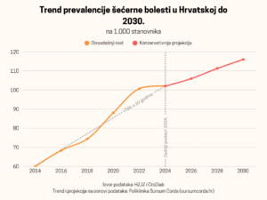 Kombinirajući stopu rasta prevalencije od 2 posto godišnje, konzistentnu s projekcijama Međunarodne dijabetičke federacije za Hrvatsku, s demografskom projekcijom DZS-a koja predviđa daljnji blagi pad stanovništva na oko 3,84 milijuna, projekcija pokazuje porast na oko 511.000 oboljelih i per capita stopu od 133 na 1000 stanovnika. To je pomak sa ”svakog osmog” na ”svakog sedmog” stanovnika.