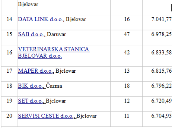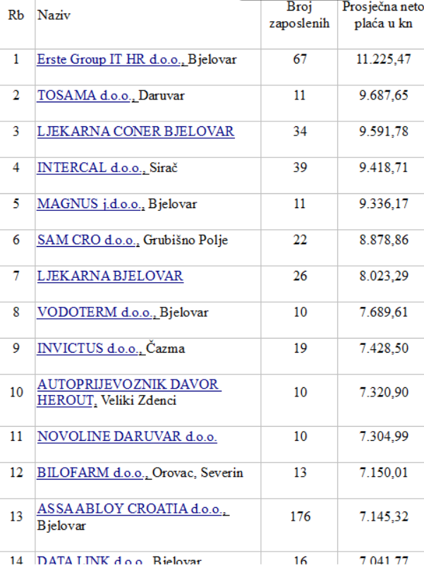 Kako navode, u istraživanje su uključili firme s najmanje 10 zaposlenih koje su registrirane kao d.o.o., zatim j.d.o.o., potom d.d. i obrtnik dobitaš… Drugim riječima, u istraživanje je bio uključen realni sektor, dok državne institucije, financijske institucije i Udruge nisu uzete u obzir. U nastavku vam donosimo popis firmi s najvišim plaćama, a vi uvijek možete provjeriti poslovanje neke firme koja vas zanima na www.firmoteka.hr-jednostavno i brzo. Točno 11 tvrtki od ukupno 20 sjedište ima u Bjelovaru, dok je ostatak raspršen uglavnom po daruvarskom i čazmanskom području. Vidite li koga poznatog? (BJLive)