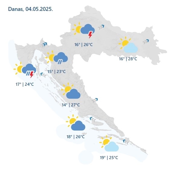 – Promjenljivo do pretežno oblačno i nestabilno. Mjestimice obilnija kiša te izraženi lokalni pljuskovi s grmljavinom, ponajviše na Jadranu i predjelima uz njega te popodne i u Slavoniji. Vjetar slab do umjeren jugozapadni, od sredine dana mjestimice sjeverni, a na moru će puhati jako jugo. Jutarnja temperatura zraka uglavnom od 12 do 17 °C, a najviša dnevna većinom između 18 i 23 °C” – navode iz DHMZ-a. (BJLive)