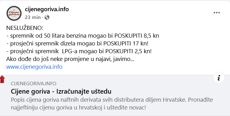 Kako javlja portal cijenegoriva.info, spremnik od 50 litara benzina mogao bi poskupjeti 8.5 kuna, spremnik dizela 17 kuna, a prosječni spremnik LPG-a 2.5 kuna.