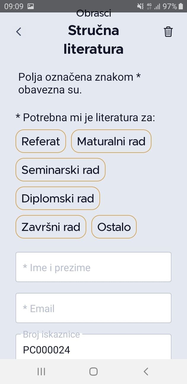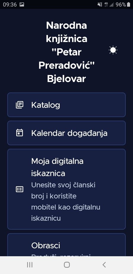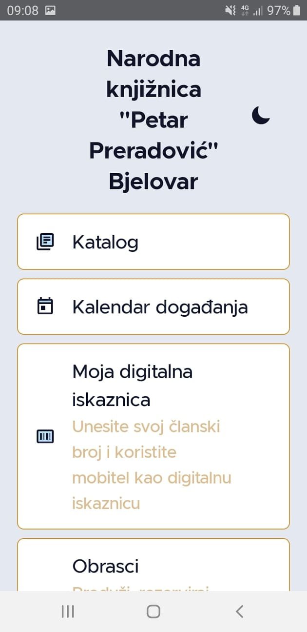 Aplikacija je namijenjena korisnicima Narodne knjižnice ”Petar Preradović” Bjelovar i jednostavno se može i jednostavno se može preuzeti i instalirati s Google Play-a i Apple Store-a upisivanjem pojmova mKnjižnica ili Knjižnica Bjelovar. Pomoću aplikacije može se pretražiti e-katalog knjižnice, pregledati kalendar događanja u knjižnici, generirati korisnički broj u barkod, produžiti rezervirati građu ili zatražiti literaturu za stručne radove. Unutar aplikacije nalazi se radno vrijeme knjižnice, odgovori na česta pitanja, kontakt podaci svih odjela i službi knjižnice te poveznice na društvene mreže. (BJLive)