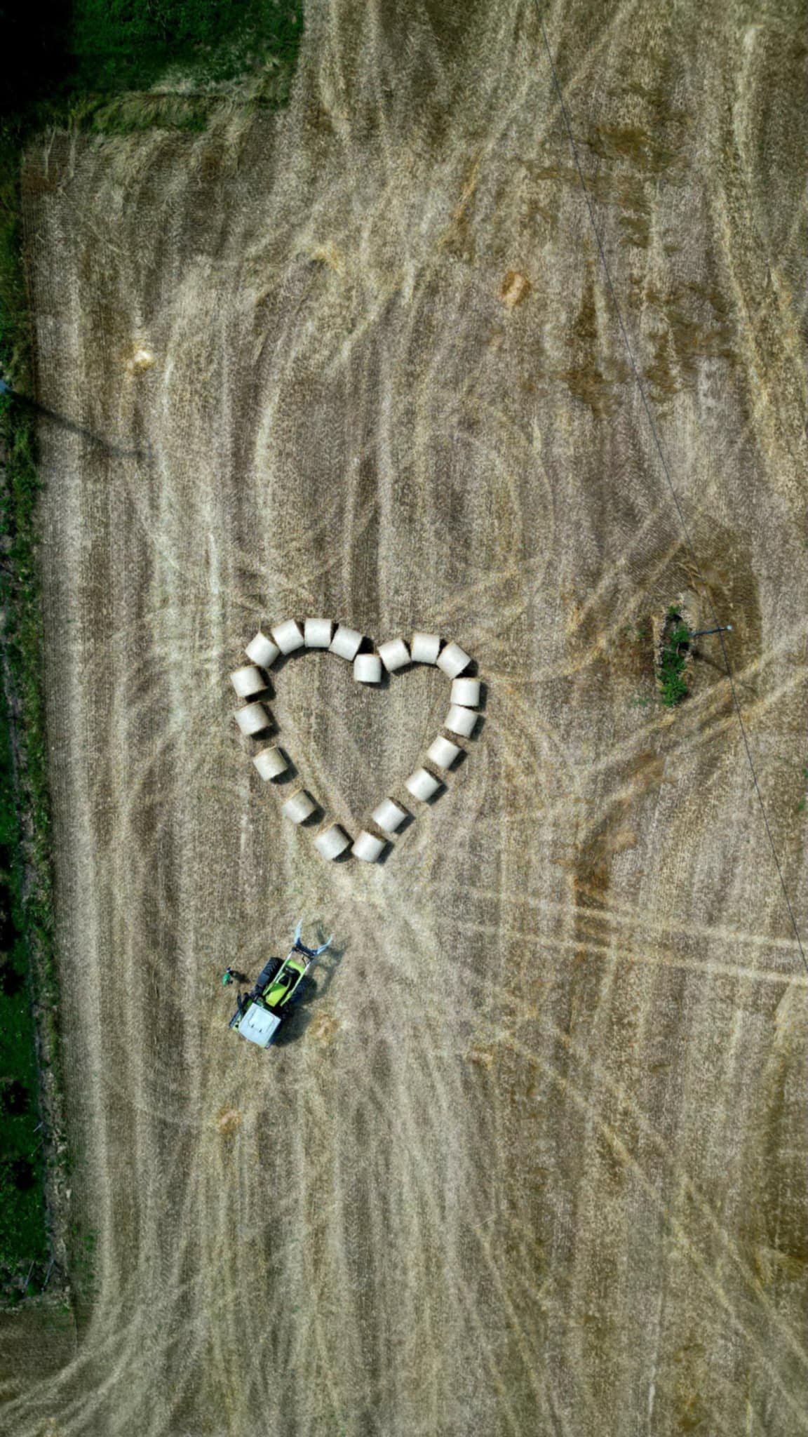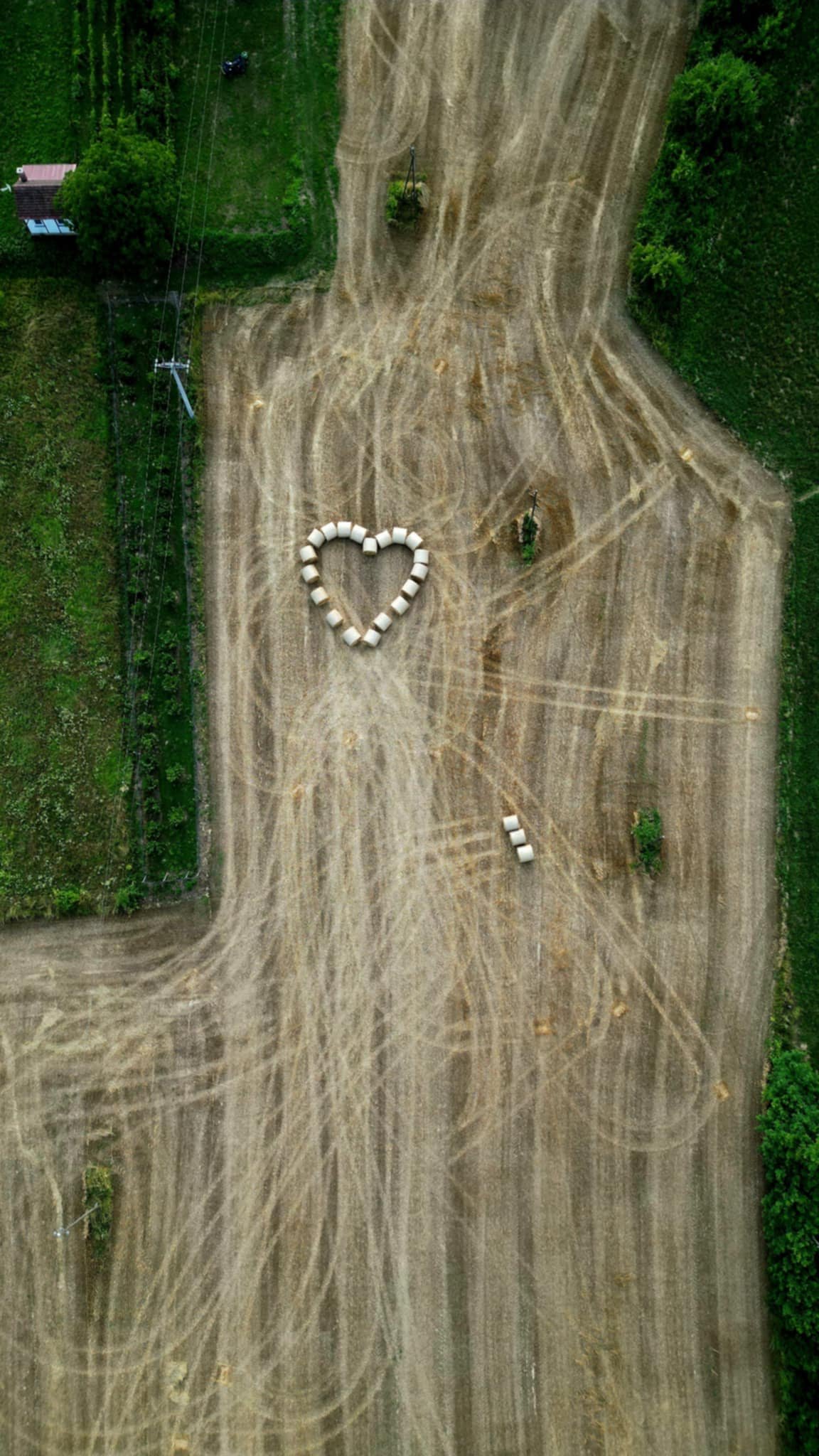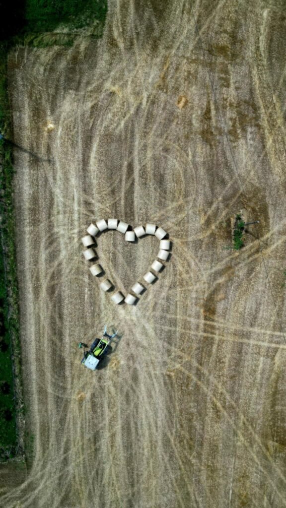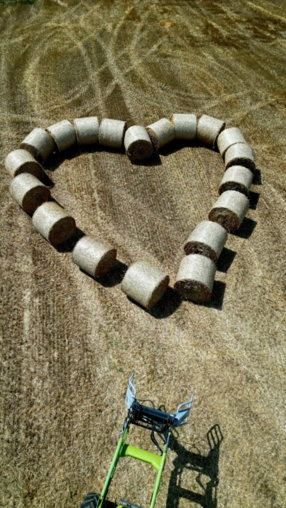 No prije nego što ih je utovario u prikolicu i pospremio, podigao je dron na oko 40 metara visine, stacionirao ga i krenuo u malu pustolovinu – slaganje bala u obliku srca.