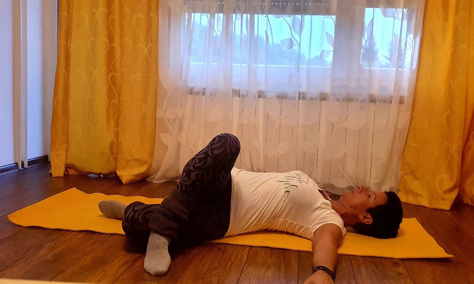 Prva je vježba važna za istezanje donjeg dijela kralježnice i kukova. Lezite na leđa. Pogrčite noge u koljenima i prebacite desnu nogu preko lijeve, ali na ”široko” – da se koljena NE dodiruju. Raširite ruke u visini ramena.
