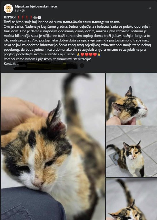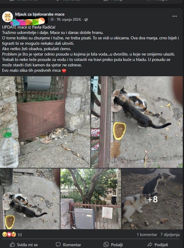 Uz apel su priložili i fotografije lutalica koje volonterke hrane, kao i mačaka koje su već zbrinule. Napominju kako sve troškove – od hrane do veterinarskih zahvata, uključujući i skupe operacije – pokrivaju same članice grupe.