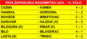 Po raskvašenim terenima i još uvijek nedovoljno pripremljeni županijski nogometni prvoligašli startali su s proljetnim dijelom prvenstva. Redovno 14. kolo usprkos obilnim kišama i vodom pokrivenim igralištima koja su bila na rubu regularnosti bilo je izuzetno efikasno. Postignut je ukupno 31 pogodak s time što su gosti upisali dvije pobjede i jednu neriješeno odigranu utakmicu.